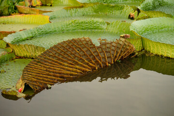 Exotic aquatic flora. Closeup view of Victoria cruziana, also known as Royal Water Lily, large green leaf underside with many nerves, floating in the river.