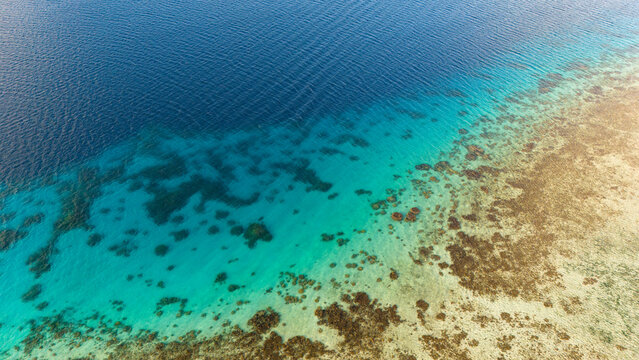 Aerial drone view of the shallow coral reef and azure blue south pacific ocean water at Araarapupu point on the tropical island of Bora Bora.