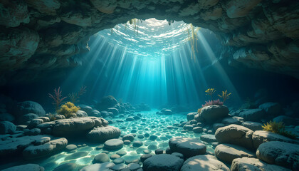 Sunlight streams into a breathtaking underwater cave, creating a magical, serene atmosphere. Ideal for travel, adventure, and conservation themes.