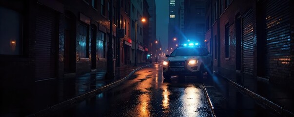 A city street at night, rain slicking the pavement, a single police car's light illuminating a dark alleyway; the scene suggests a mysterious investigation is underway , alleyway, noir