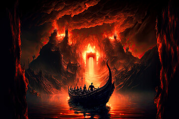 Charon's ferry crossing the river Acheron, Dante's Inferno. Generative AI