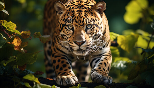 Bengal tiger staring, close up portrait of majestic undomesticated cat generated by AI