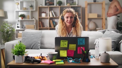 A young woman communicates with colleagues via video, while her undressed husband walks around the room in the background