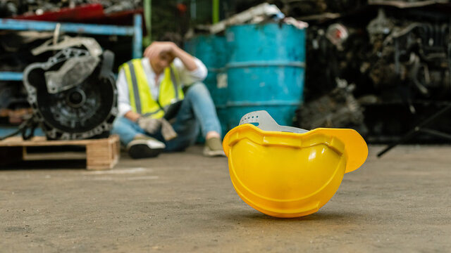 Close up yellow safety hardhat on floor with man stressed and unemployed in factory, standard horizontal banner 16:9.