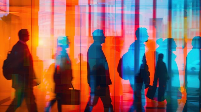 Shuttered windows, unemployment line, close up, focus on, copy space, vibrant colors, Double exposure silhouette with jobless people