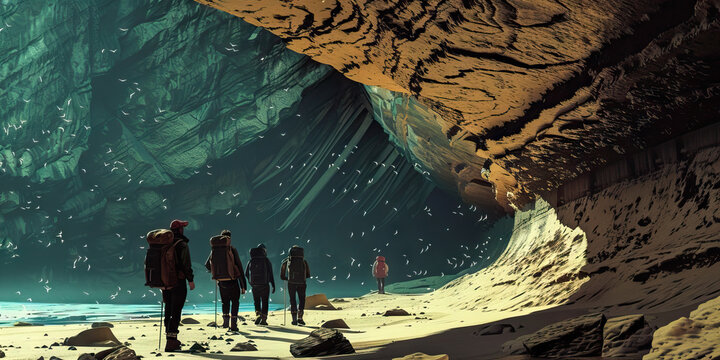 Underground Expedition: A group of explorers descending into a deep, unexplored cave