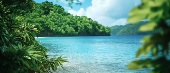 A tropical paradise unfolds as lush greenery frames turquoise waters against a clear azure sky, offering both serenity and vibrant beauty.