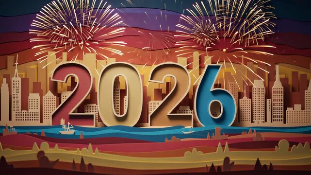 Festive fireworks illuminate vibrant urban skyline celebrating 2026 new year