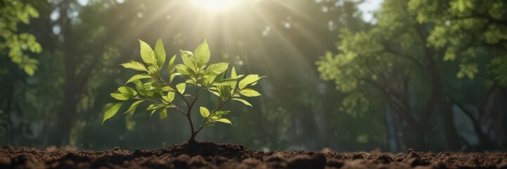 Sunlit green sprout emerges from rich soil, leaves unfurl, fresh, garden, new