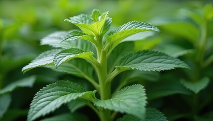 Fresh green mint plant sprout close up. Young mint leaves unfurl on stem. Healthy herb grows in garden bed. Natural food seasoning ingredient.