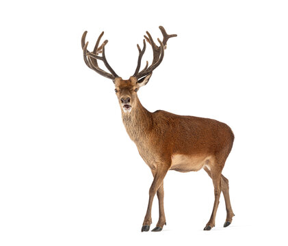 Red deer stag with large antlers standing on white background