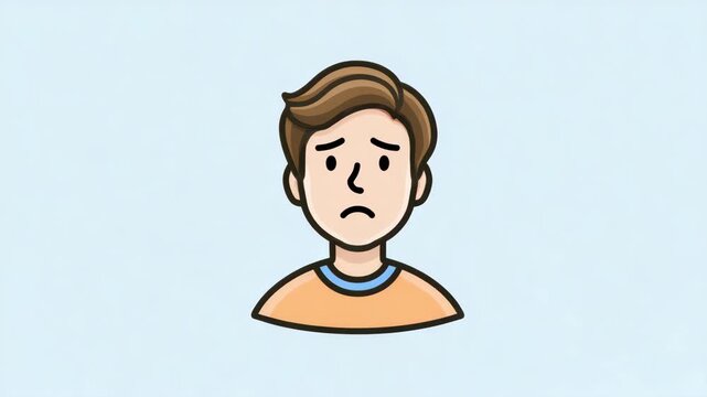 Cartoon style sad boy with brown hair wearing an orange shirt, shown on a light blue background, expressing worry or unhappiness concept