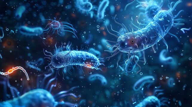A geometric design of many microbes and unicellular organisms. Blue glow on dark background. Generative AI.