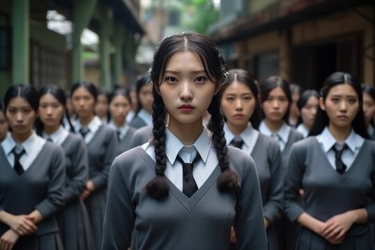 A group of children in uniforms rushes through a bustling school hallway, capturing the dynamic and animated atmosphere typical of a busy school day, bursting with energy.
