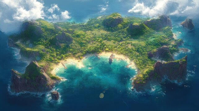 A serene aerial view of a pristine, uninhabited tropical island, showcasing lush green canopy, white sandy beaches, and crystal clear turquoise waters.