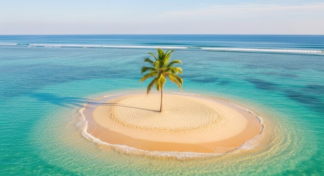 Isolated palm-studded isle in vibrant turquoise water , isolated, remote, flora