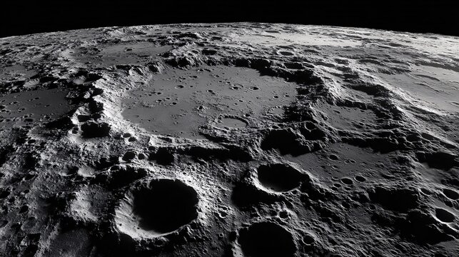 High-resolution black and white close-up of lunar surface with craters and shadows