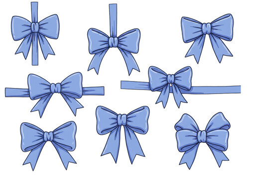 Nine pastel blue hand-drawn ribbon bows, unique shapes and crisp outlines, cel-shaded and scattered on a transparent background with copy space, cute graphic design element concept