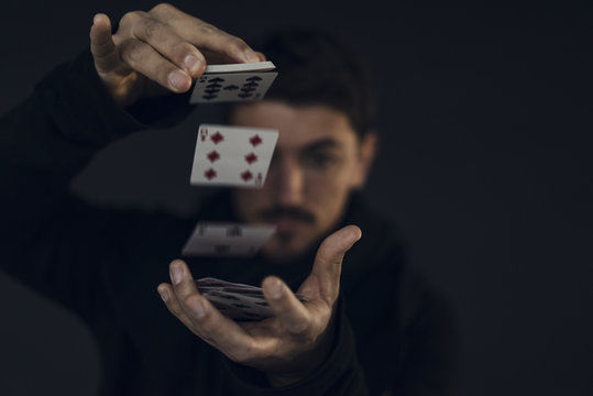 Magician conjuring with playing cards, close-up