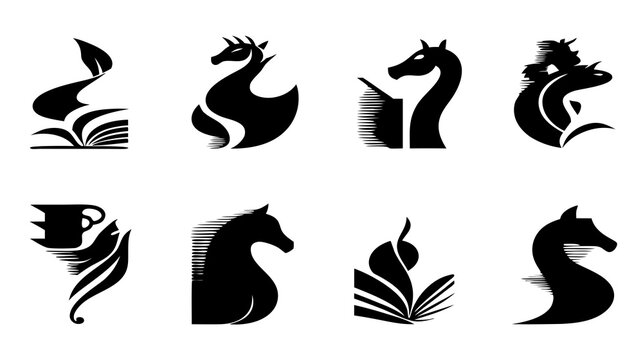 Modern abstract horse and book logo collection. Stylized equine head symbols with open books, leaves, black and white minimalist graphic icons.