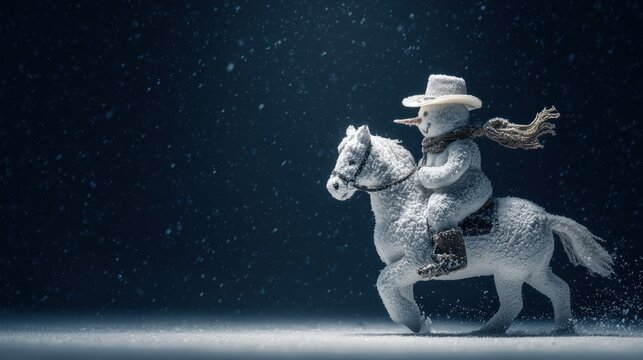 Snowman Cowboy in Winter Wonderland: A whimsical snowman cowboy rides gallantly atop a frosted steed through a serene, snowy landscape, creating a scene of winter joy and adventure.