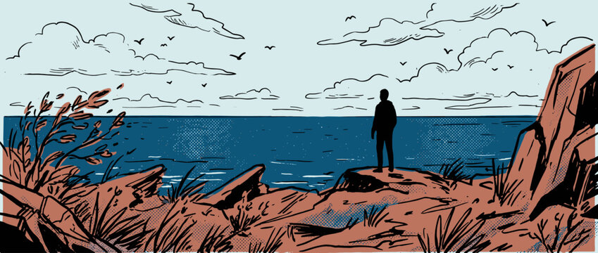 Graphic novel style illustration of a person standing alone on a rocky cliff, looking out at the vast ocean under a cloudy sky in a contemplative and peaceful scene