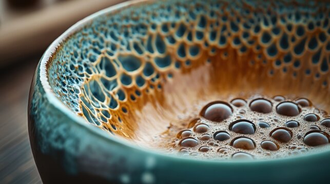 A close-up of a handmade pottery bowl with a unique glaze and textured finish.