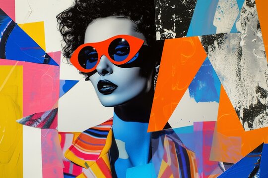 A vibrant collection of four abstract poster designs featuring bold colors and geometric shapes. Each poster showcases unique themes such as curves, lines, color blocks, and display elements