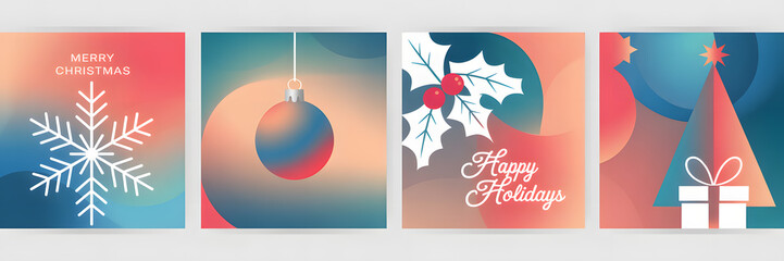 Festive Greetings: a collage of four elegantly designed cards embodying the spirit of the season. Each design, a unique blend of color and form, features iconic holiday symbols.