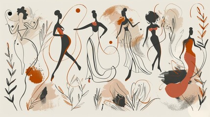 Vintage wall art featuring abstract women in various poses and attire, drawn with line art and organic shapes. Ideal for posters, wall decor, wallpaper, or banners, capturing a trendy style.