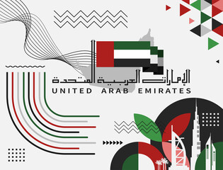 UAE national day banner for independence day. Flag of United Arab Emirates and modern geometric abstract design. Red green black theme. Country name in Arabic calligraphy. Dubai landmarks. Vector.