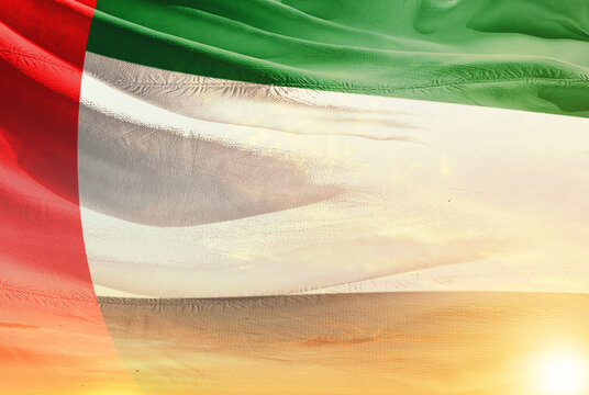 United Arab Emirates national flag waving in sunny sky with beautiful sunset. UAE national flag for independence day.