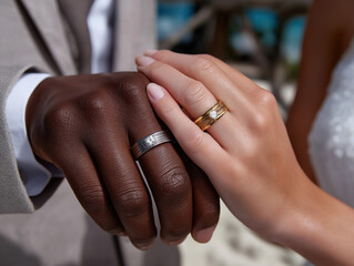 Wedding rings displayed during a beach ceremony with hands united