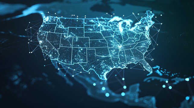 Abstract digital map of the Americas, American global network concept and connectivity, data transfer and cyber technology, information exchange and telecommunications. EE.UU.