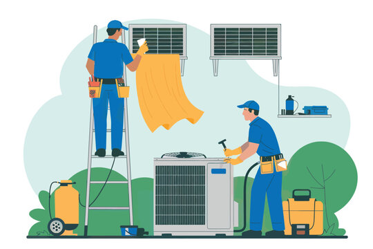 Industrial air conditioning units mounted on modern building exterior wall. HVAC systems provide climate control for commercial spaces