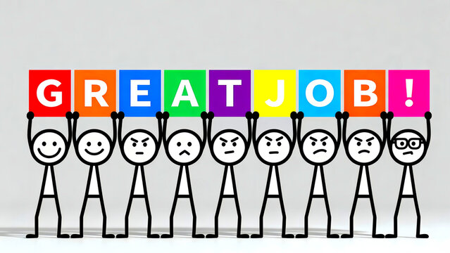 Great job teamwork achievement success celebration congratulations encouragement motivation appreciation recognition reward performance effort stick figures cartoon characters colorful cards
