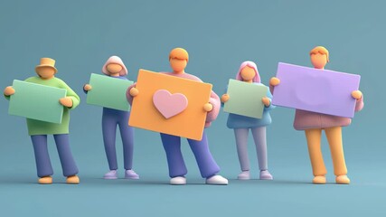 Living with cancer support group holding colorful signs with heart symbol in supportive gesture
