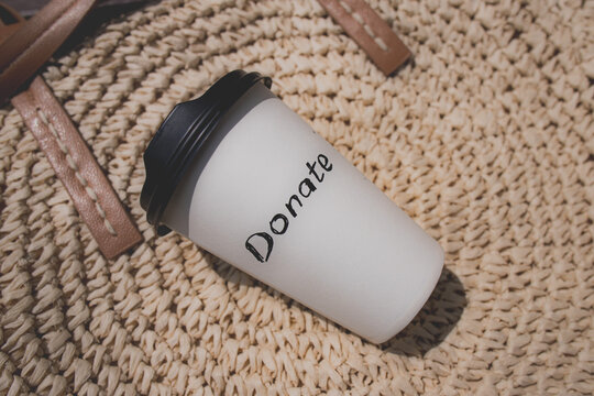 Paper cup with coffee and the inscription "donate". Coffee to go. Donation in lieu of coffee. Share with others. Helping people. Ukrainian mutual aid. Kind people. Faith in people. Call to donate.