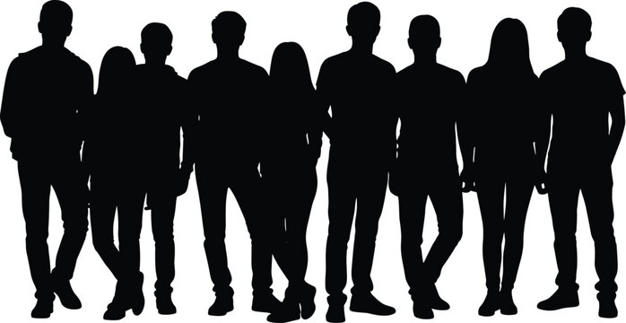 Large group of diverse people standing together, black silhouette vector illustration isolated on white background, for teamwork, community, and social designs.