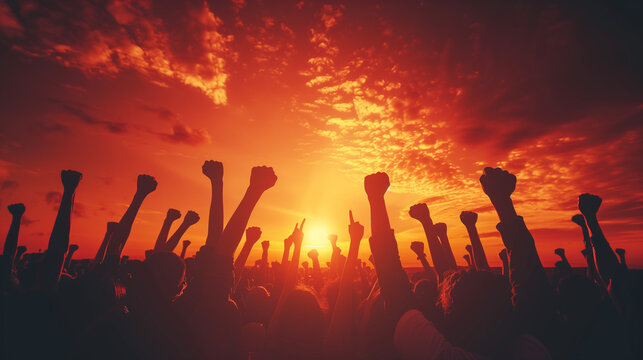 Colorful illustration of many hands raised in the air, symbolizing unity, diversity, and participation.