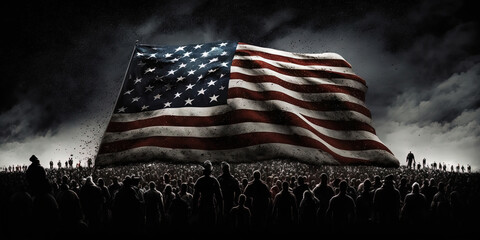 thousands of people cheering, an American flag in the sky, grim, dark. AI Generated.