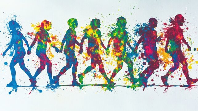 A vibrant watercolor silhouette of diverse people walking together, representing unity and community.