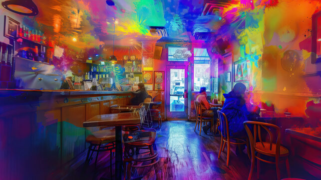 Parallel Universe Cafe: Surreal Painting. Cafe with Customers from Parallel Universes. Blurring Boundaries of Reality. Surreal Cafe of Parallel Universes