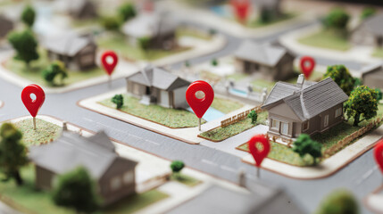 Miniature suburban neighborhood with red location pins symbolizing navigation technology