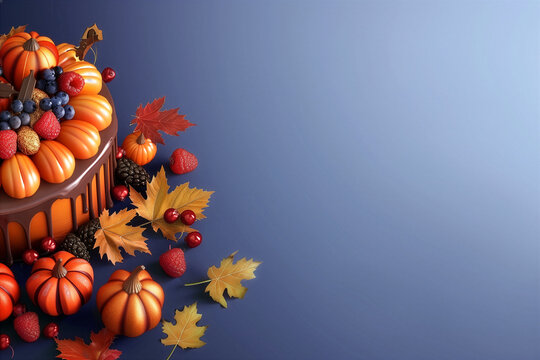 Gâteau décoré de citrouilles, fruits rouges et feuilles d’automne sur fond bleu avec espace négatif copyspace, visuel culinaire saisonnier pour campagne gourmande, Halloween ou fête de la récolte