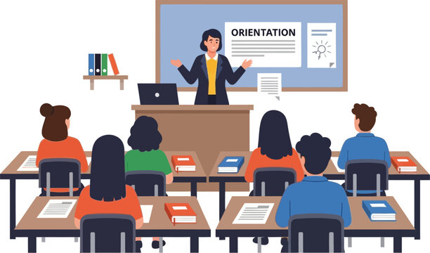 Students attending a university orientation session, taking notes and asking questions to prepare for the academic year ahead
