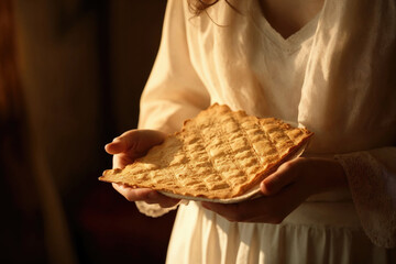Traditional unleavened bread matzah and a silver wine cup set for a Jewish Passover meal