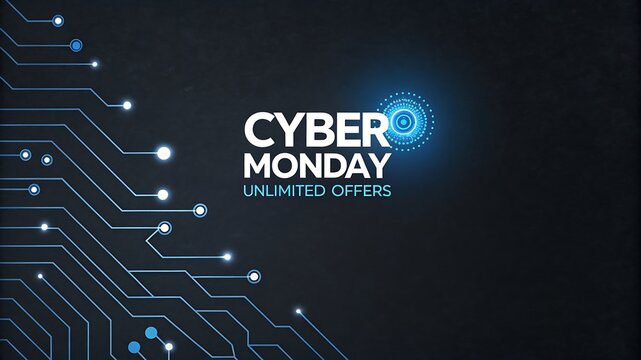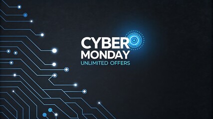 Cyber monday unlimited offers with futuristic circuit board pattern and glowing blue digital element