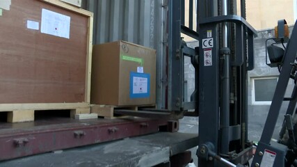 Yerevan, Armenia - September, 2021. Loader unload pallets with boxes from a trailer truck. Close up. Slow Motion
