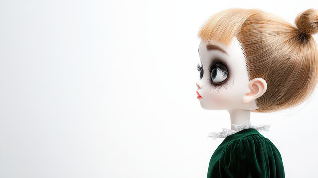 Haunted doll with soft porcelain texture and cracked cheek appears melancholic, evoking sense of eerie beauty and unnerving vulnerability, gazing off into distance